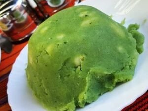 Kenyan meal prepared by mashing potatoes,corn and green vegetables.