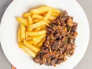 Beef tripe that is fried with onions, tomatoes, salt and other spices.