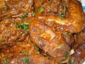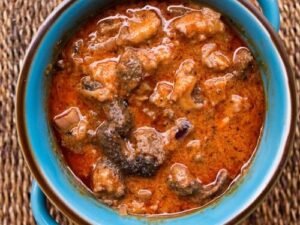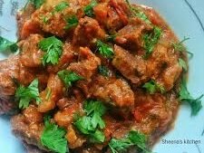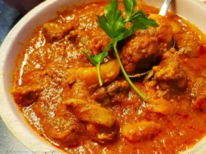 Stewed beef cooked with curry powder and other spices in a tomato based sauce.