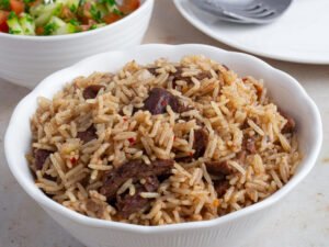 A rice based meal cooked with beef and spices. Served with kachumbari.
