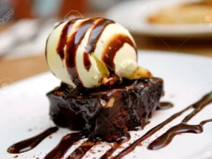 A warm, gooey chocolate brownie with macadamia nut pieces topped with a vanilla ice-cream & fudge sauce