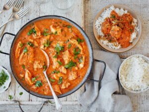 Boneless chicken breast pieces in a spicy, double onion curry sauce Served with coriander & lime scented rice, papadam & mango chutney