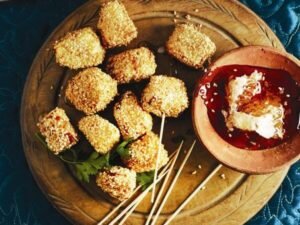 Golden-fried cubes of sesame coated halloumi cheese drizzled with warm honey