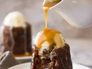 An old-fashioned sticky date pudding served piping hot, smothered with thick toffee sauce with walnuts & a scoop of vanilla ice-cream