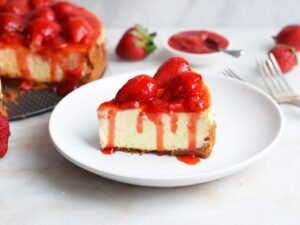 Our version of a New York style cheesecake features a traditional digestive biscuit base & a rich cream-cheese filling baked to perfection & topped with fresh, juicy strawberries & home-made strawberry sauce