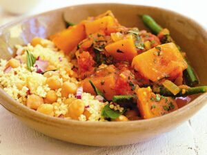 Chunky mixed vegetables gently cooked in Moroccan spices with apricots & chickpeas Served on a bed of jewelled couscous & garnished with toasted flaked almonds